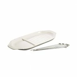 The XL Kebab Platter presents all your BBQ and grilled masterpieces in style. This 20-1/2 in. x 8-1/2 in. porcelain platter has notched sides to securely hold up to 8-skewers (not included) while transporting from grill to table. No need to worry about kebabs rolling away. To retain the texture of perfectly cooked meats, drainage grooves in the bottom of the platter raise meats above juices. There is also a separate compartment to showcase additional gourmet selections if desired. Made in Germany, this beautiful and highly functional premium porcelain platter is dishwasher and microwave safe.