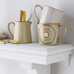 Denby Heritage Veranda 10 oz. Large Mug imparts a rustic vibe to your kitchen decor. The mug is high-quality stoneware and expertly glazed to prevent chipping. It features a curvy and chic handle that adds to the elegance and lets you sip your beverage with style. With its subtle color tone and edge detailing, this mug is sure to elevate your table setting.