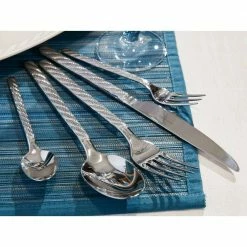 The Montauk collections design hearkens the maritime trend with reserved elegance. Its both formal and decorative. 18/10 stainless steel for lasting shine and durability. Rust resistant finish for years of lasting beauty. A relaxed oceanside atmosphere is guaranteed. Dishwasher safe. 5-piece place setting includes 1 each: Dinner Fork 8.25 in. x 1 in., Dinner Knife 9.5 in. x 75 in., Salad/Dessert Fork 7.75 in. x 2.5 in., Dinner Spoon 8.25 in. x 2.75 in. and Teaspoon 6 in. x 2.5 in.